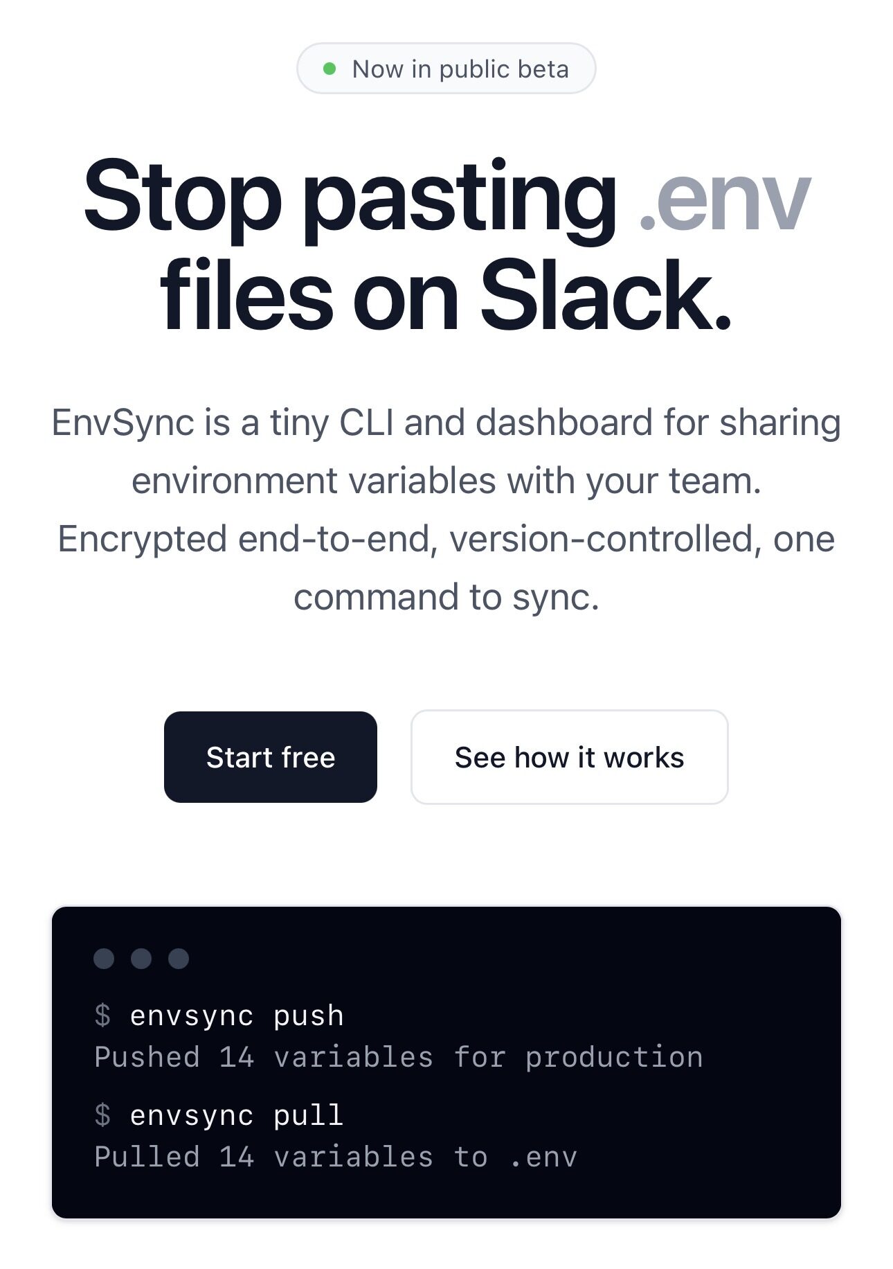 Un .env qui circule en DM, sur un drive partagé ou dans une discussion Slack, c’est une fuite qui attend de se produire. EnvSync remplace ce désordre par un flux clair, chiffré et auditable.